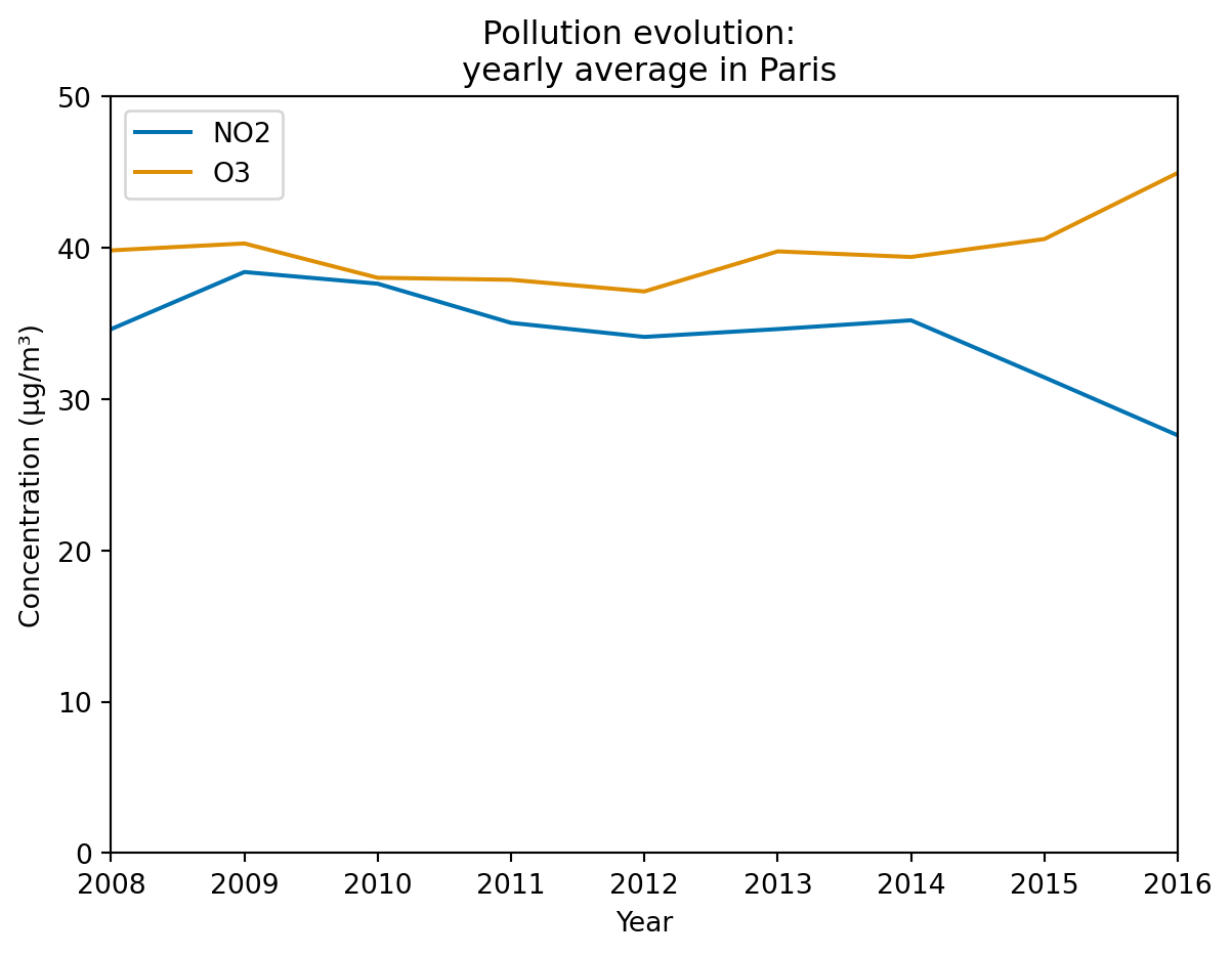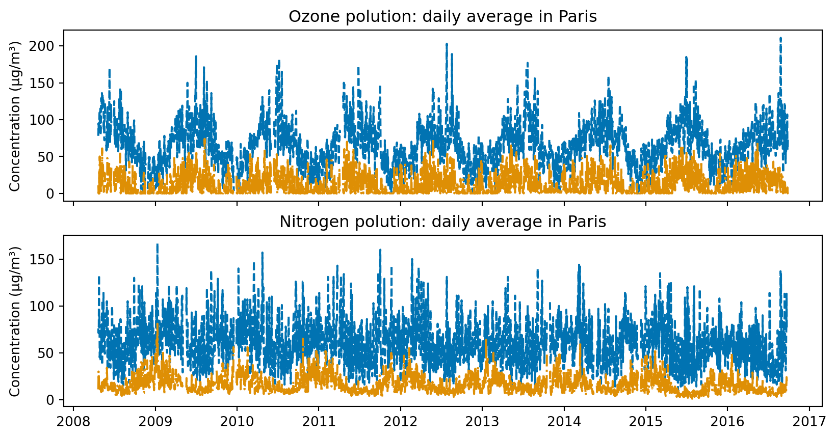 axes[0].set_title("Ozone polution: daily average in Paris")